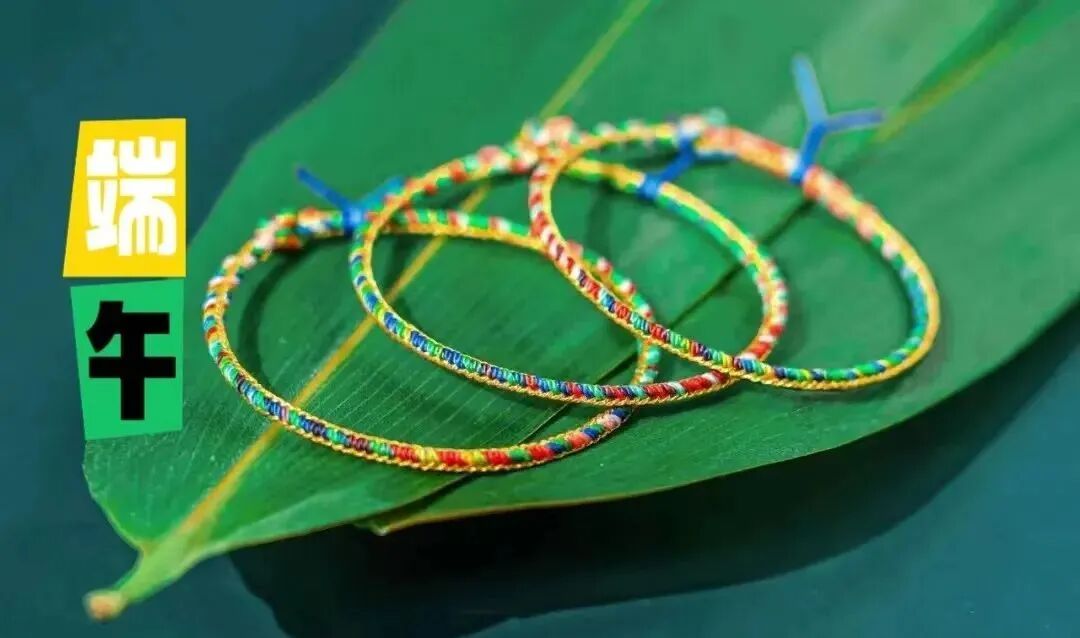 2. 戴五色线:五色线由红、黄、蓝、白、黑五种颜色的丝线,然后拧成彩缕。人们会在端午节清晨将其拴在孩子的手腕、脚腕和脖颈上,以避邪和防止五毒近身,端午节过后,五色线要扔到河里,意喻让河水冲走瘟疫、疾病。
