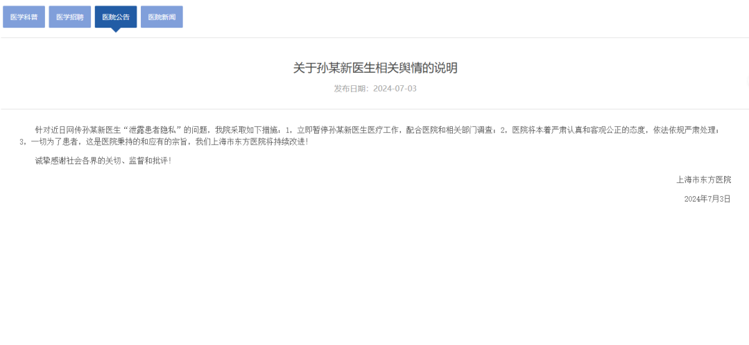 公开资料显示,孙某新,同济大学教授、主任医师、医学博士,同济大学及南京医科大学博士生导师,上海市东方医院本部创伤外科主任,中国国际应急医疗队(上海)执行队长。曾入选浦东新区医学领先人才及优秀医学学科带头人计划。此前据上海市东方医院预约挂号系统显示,涉事医生目前仍在正常上班。 7月3日上午,针对上述举报情况,上海市东方医院相关工作人员称,已经知晓此事,“目前内部正在了解和处理”。对于网络上的举报内容是否属实,该工作人员表示,正等有关部门进一步核实。东方医院投诉科工作人员则表示,不方便回应此事。 同日下午,上海市浦东新区卫健委一工作人员称,已接到实名举报信息,相关部门正在调查此事。 7月3日,上海市东方医院发布关于孙某新医生相关舆情的说明: