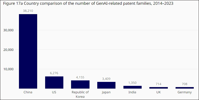 中国生成式AI专利申请量全球第一!约美国的六倍发表时间:2024-07-04 11:41 ![]() 7月3日,联合国世界知识产权组织(WIPO)发布最新报告显示,中国在聊天机器人等生成式人工智能(AI)发明方面远远领先于全球其他国家,申请的专利数量足足是美国的六倍。 根据该组织发布的《生成式AI专利态势报告》统计数据,在2014至2023年的十年间,生成式AI的专利申请数量在全球范围内激增,超过5万份,其中超四分之一专利申请于2023年提交。 据介绍,生成式AI是一种从现有信息中生成文本、图像、计算机代码甚至音乐的技术,目前已在生命科学、制造业、交通运输、安全和电信等行业中应用普及。 世界知识产权组织表示,过去十年间,中国提交了超3.8万份生成式AI专利申请,是同期美国提交申请数量(6276份)的约六倍。韩国、日本和印度则分别排名第三,第四和第五。