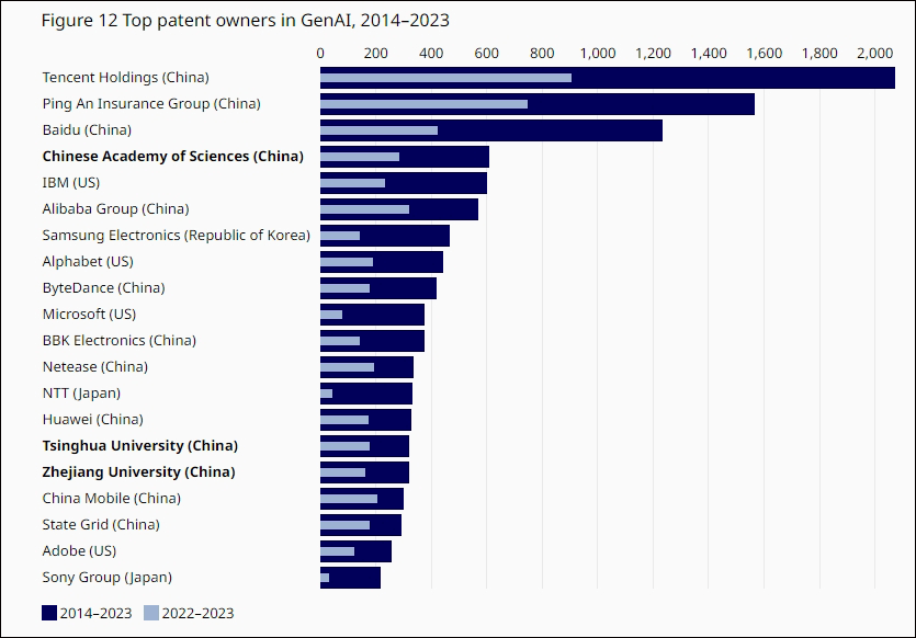“生成式AI已成为一项改变游戏规则的技术,有可能改变我们的工作、生活和娱乐方式,”世界知识产权组织总干事邓鸿森表示,“我们相信,这份报告将使创新者、研究人员和其他人能够驾驭快速发展的生成式AI格局及其对世界的影响。” 据路透社报道,当天,世界知识产权组织专利分析经理克里斯托弗·哈里森表示:“这(生成式AI)是一个蓬勃发展的领域,也是一个增长速度越来越快的领域……数据表明,该领域将对未来许多不同的工业部门产生深远影响。”他指出,中国专利申请范围非常广泛,涵盖了从自动驾驶、出版,再到文件管理。 美国智库“安全与新兴技术中心”(CSET)发现,全球AI研究论文数量排名前五的都是中国机构,以中国科学院为首;在高引用率论文数量方面,中国机构仍前五占二,中国科学院和清华大学分别排名第一和第三,谷歌、斯坦福大学和麻省理工学院分别排名第二、第四和第五。 “中国在人工智能研究领域绝对处于世界领先地位,且在很多领域都可能是世界领先者,”CSET团队分析主管扎卡里·阿诺德补充说,现在,中国在一系列AI研究领域都很活跃,包括越来越多的基础研究。 图片来源:WIPO 编辑:开心 排版:开心 审核:溪溪 END 实时播报,关注民声 投稿:gaojian@xibunews.com 如有不实,侵权请联系作者