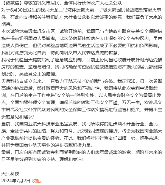 此前于6月30日,多名河南巩义市市民发布视频,一火箭飞行途中冒黑烟,后坠落起火。当日下午,经河南巩义市应急管理局确认,一民营火箭公司在该市进行火箭发动机试车时发生事故,火箭从试车架上意外起飞升空,随后在一处山区坠毁。巩义市应急管理局接报这起事故后已前往现场处置,暂无人员伤亡报告。 有知情人士透露,该事故涉及的火箭为天兵科技公司天龙三号首飞箭,试车部分为该火箭的一级。早在今年6月6日,天兵科技曾在其官微表示,其自主研发的110吨推力液氧煤油火箭发动机“天火十二”,作为天龙三号的主动力系统,已成功完成数十台次交付试车;天龙三号火箭也完成了总装总测,将于6月底完成一子级火箭九机并联全系统热试车,随后奔赴发射场开展首飞试验。 天兵科技官网显示,天龙三号火箭是国内商业航天首款大型液体运载火箭,该火箭采用二级构型设计,以液氧和煤油作为主推进剂,该火箭按计划将于2024年9月完成首飞任务,并在首飞后的三年内具备每年超过30次的商业发射能力。 据了解,天兵科技是一家中国民营商业航天公司,成立于2019年4月10日。公司主要致力于研发新一代液体火箭发动机及中大型液体运载火箭。2023年4月,天兵科技天龙二号遥一运载火箭自中国酒泉卫星发射中心成功发射,创造了全球民营液体火箭首飞即成功等8项商业航天纪录。 巩义市政府官网显示,天兵科技于2020年成立巩义市天兵航天科技有限公司,并在巩义市规划建成了天兵科技综合试验中心,投入使用了天兵天霄系列四个百吨级以上推力的试车台,承担了天兵科技液体火箭的所有研制试验项目。2022年,天兵科技天龙二号液体运载火箭同样在天兵巩义综合试验中心进行一级动力系统试车,并取得圆满成功。 当日晚间,北京天兵科技有限公司发布《关于天龙三号大型液体运载火箭一子级动力系统试车的情况说明》。 ![]() 7月2日,北京天兵科技有限公司官方微博发布致歉信。