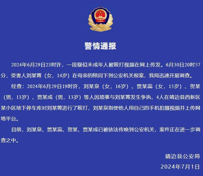 7月1日,据靖边公安公众号消息:陕西省靖边县公安局发布警情通报称,经查,2024年6月29日23时许,一段疑似未成年人被殴打的视频在网上传播,6月30日20时57分,受害人刘某箐(女,14岁)在母亲的陪同下到公安机关报案。