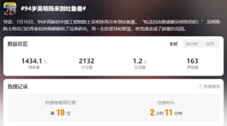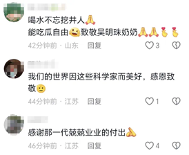 #94岁吴明珠来到吐鲁番#微博话题引发网友的关注,网友们纷纷给吴奶奶送祝福表示感谢,“感谢吴明珠奶奶,让我们吃上这么甜的西瓜”“感谢那一代兢兢业业的付出”