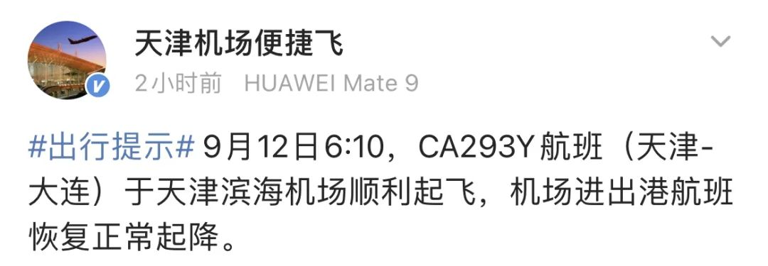 9月12日6时10分,CA293Y航班(天津-大连)于天津滨海机场顺利起飞,机场进出港航班恢复正常起降。