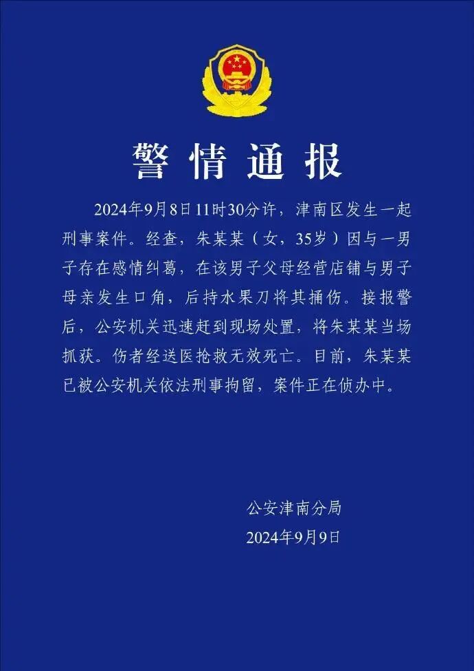 天津一女子因情感纠葛持刀捅杀男子母亲致死!警方通报