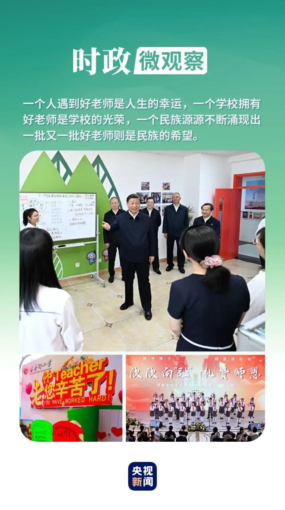 △2023年教师节前,广西南宁一所学校,学生向老师献上鲜花、贺卡。 “三寸粉笔,三尺讲台系国运;一颗丹心,一生秉烛铸民魂。”今天的学生是未来实现中华民族伟大复兴中国梦的主力军,广大教师就是打造这支中华民族“梦之队”的筑梦人。 习近平总书记提出并全面阐释的教育家精神,把对新时代教师的要求提到了全新的高度,为我们打造高素质教师队伍、推进教育高质量发展、建设教育强国指明了方向、提供了遵循。 立足我国由教育大国向教育强国系统性跃升的关键历史节点,广大教师正以教育家精神为引领,用过硬的专业能力、渊博的知识水平、深沉的仁爱之心,承担起为中国式现代化培育时代新人的重任。 来源:央视新闻客户端 编辑:开心 | 审核:溪溪 END 实时播报,关注民声 投稿:gaojian@xibunews.com 如有不实,侵权请联系作者 声明:部分文章来源于网络,转载发布,版权归原作者所有,仅作为参考,如果网站中图片和文字侵犯了您的版权,请联系我们处理!发布是出于传递更多信息之目的并不意味着赞同其观点或证实内容的真实性。http://www.westtimes.cn/h-nd-2020.html