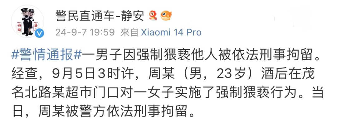 9月7日,上海市公安局静安分局发布警情通报:一男子因强制猥亵他人被依法刑事拘留。