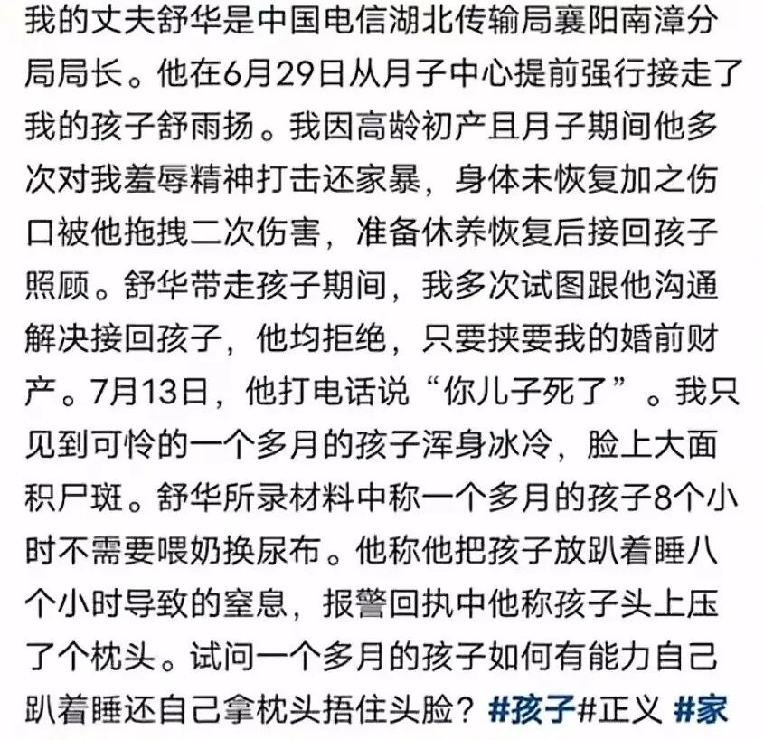2024年6月29日,杨女士离开月子中心休养,儿子则被舒某带回其父母家。7月13日早上7时许,杨女士突然接到舒某的电话,被告知“儿子死了”。当杨女士赶到医院后,发现孩子已经浑身冰冷,脸上还有大面积的尸斑,怀疑儿子是被舒某在家虐待致死,于是选择报警。 据襄阳市公安局襄城区分局檀溪派出所开具的《接报警回执》显示,经民警出警后了解,7月12日22时许,舒某将舒某扬哄睡后怕其掉下床,便在旁边放了一个枕头挡着,自己睡在另一边。13日凌晨6时许,舒某起床后发现舒某扬的头部在枕头下边,将枕头拿开后发现其面部发青已没有呼吸。舒某便拨打120将舒某扬送至襄阳市中心医院(湖北文理学院附属医院)抢救。7时许,救治医生告知舒某抢救无效,舒某扬已死亡。分局刑侦大队法医在现场进行初步尸检,认定舒某扬属窒息式死亡,表面无外伤,排除刑事案件可能。 7月16日,檀溪派出所委托襄阳汇驰司法鉴定中心对舒某扬进行死亡原因鉴定。该司法鉴定中心于8月1日开具出《司法鉴定意见书》,其中分析称,根据法医学尸体检验并结合案情,被鉴定人应为头面部长时间偏于右侧,导致呼吸不畅,加之被鉴定人为59天婴儿,可形成体位性机械性窒息,未能发现,直至死亡并形成尸斑。鉴定意见为:符合因体位性机械性窒息死亡。襄阳市公安局襄城区分局于8月7日决定,对舒某过失致人死亡案立案侦查。 9月6日下午,舒某证实,自己被警方以“过失致人死亡”立案侦查,并称自己办理了取保候审手续。 END 来源:红星新闻 编辑:王宇豪 排版:王宇豪 审核:溪溪 ![]() 关注西部聚焦 获取更多资讯 声明:部分文章来源于网络,转载发布,版权归原作者所有,仅作为参考,如果网站中图片和文字侵犯了您的版权,请联系我们处理!发布是出于传递更多信息之目的并不意味着赞同其观点或证实内容的真实性。http://www.westtimes.cn/h-nd-2035.html