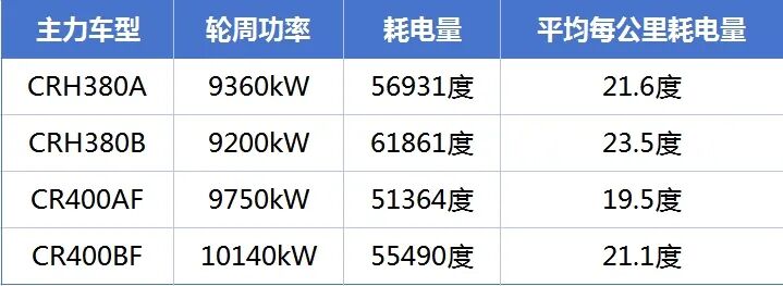 “中国高铁动车组一公里耗一万度电”的说法偷换了概念,与事实不符。以现有CRH380A、CRH380B、CR400AF、CR400BF等4个8编组的主力车型为例,其轮周功率分别为:9360kW、9200kW、9750kW、10140kW,通过在京沪高铁(往返距离2636公里)达速350km/h运行条件下的能耗测试数据显示,其耗电量分别为:56931度、61861度、51364度、55490度,据此推算出平均每公里耗电量分别为:21.6度、23.5度、19.5度、21.1度。