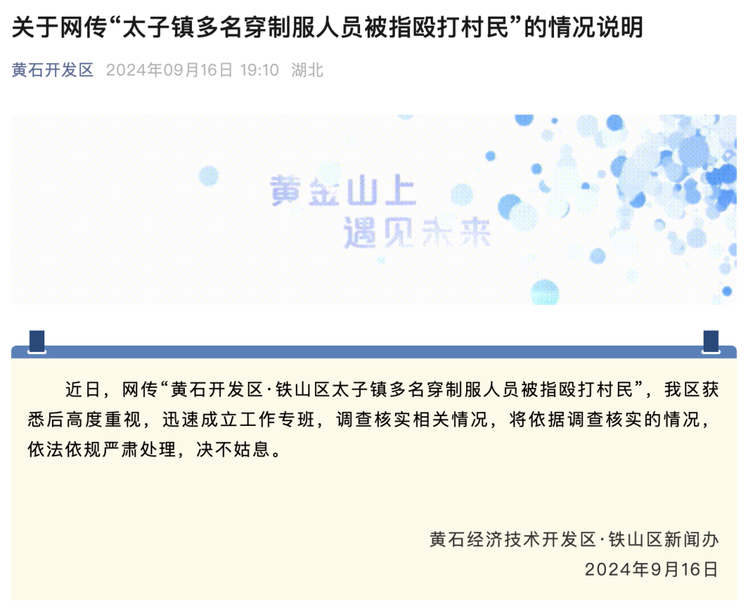 湖北黄石多名身穿制服人员殴打村民!官方通报发表时间:2024-09-17 20:19来源:西部时报