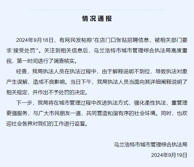 商户在自家店门口贴招聘信息被罚?内蒙古乌兰浩特通报发表时间:2024-09-19 14:46来源:西部时报