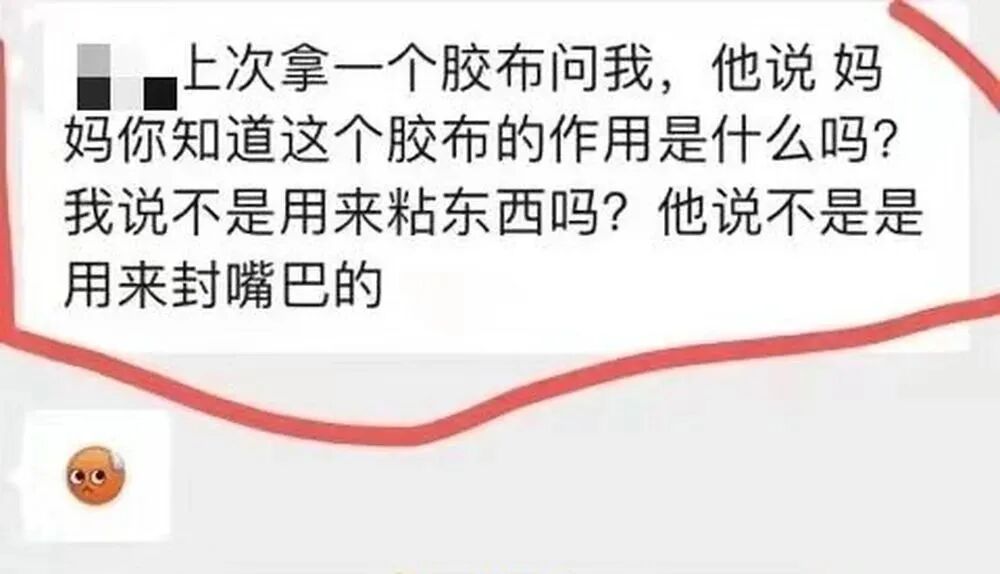 据该家长提供的聊天截图显示,涉事班级家长群中,有家长称“某某上次拿一个胶布问我,他说妈妈你知道这个胶布的作用是什么吗?我说不是用来粘东西的吗?他说不是,是用来封嘴巴的。他说上班(在班级)说话老师就拿来封嘴巴。”
