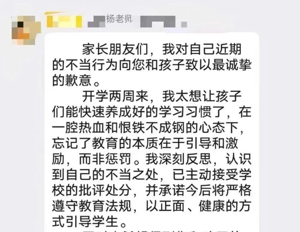 此外,还有家长提供了涉事老师在群内的道歉截图,该老师在道歉中称:“家长朋友们,我对自己近期的不当行为向您和孩子致以最诚挚的歉意……”