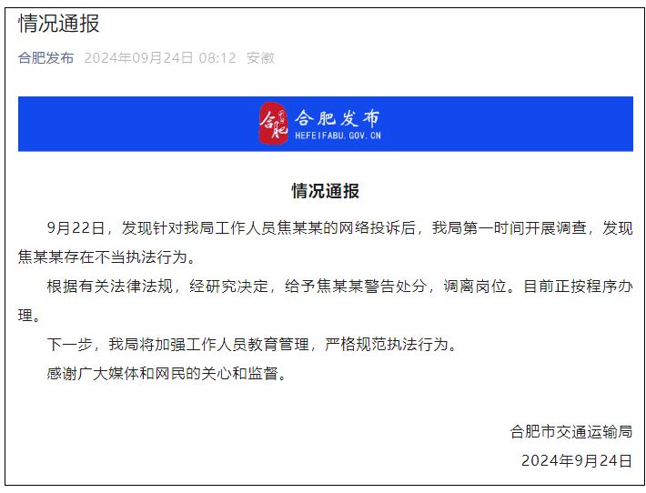 9月20日事发现场视频截图 执法人员是否可以单人着便装执法?合肥市交通运输执法支队工作人员表示,执法时人员需要两人,且需身着执法服装,“有专门统一的规定,肯定要穿执法服装了。” 上述事件发生后,合肥市交通运输局第一时间开展调查,发现焦某某存在不当执法行为。根据有关法律法规,经研究决定,给予焦某某警告处分,调离岗位。目前正按程序办理。 合肥市交通运输局表示,下一步将加强工作人员教育管理,严格规范执法行为。 来源:综合合肥发布、九派新闻等 编辑:开心 | 审核:溪溪 END 实时播报,关注民声 投稿:gaojian@xibunews.com 如有不实,侵权请联系作者 声明:部分文章来源于网络,转载发布,版权归原作者所有,仅作为参考,如果网站中图片和文字侵犯了您的版权,请联系我们处理!发布是出于传递更多信息之目的并不意味着赞同其观点或证实内容的真实性。http://www.westtimes.cn/h-nd-2218.html
