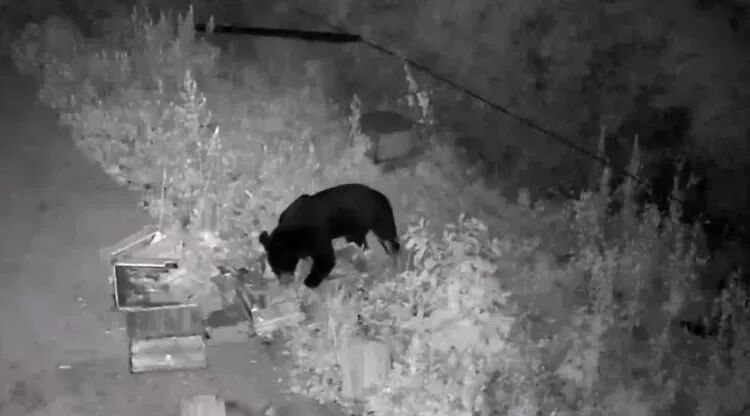 据其提供监控画面显示,2024年6月30日晚11时59分,一头熊跑来偷吃蜂蜜;7月18日晚10时18分,一头熊来到院内用爪子拍打蜂箱;7月20日晚7时31分,一头熊跑来推倒蜂箱,叼着蜂箱跑到草丛中;没过一会,这头熊又跑了回来,坐在地上吮吸着蜂蜜。