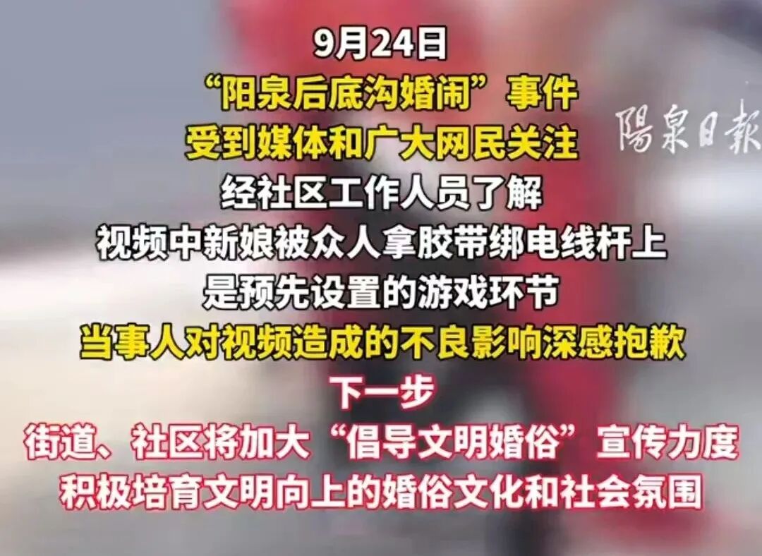 据网传视频画面显示,伴随鞭炮声,一男子背着身穿红色嫁衣、盖着红纱的新娘不断向前跑,身后还有多名男子追逐拦截。而后,新娘被男子背到一根电线杆前,多名男子则配合着用胶带把新娘绑在电线杆上。 ![]() 期间,新娘多次尖叫,并有伸手抓挠的动作,但却无人理会。多名男子继续在笑声中捆绑新娘,一位疑似新郎、佩戴胸花的男子还在向身边的男子小声说话。最终,在无人支撑的情况下,新娘弯着腿被绑在电线杆上。画面还显示,众人经过的一块宣传栏上写有“后底沟社区”字样。 ![]() 评论区中,视频发布者对关注此事的网友统一回复称:无任何不良引导,只是当地风俗。都是发小,在一起很开心,玩玩闹闹,请大家不要臆想,我希望评论区留下的是新婚快乐。 ![]() 9月24日,男方亲友回应称,不认为他们的行为是婚闹,因为事先给新娘新郎打过招呼,征得两位新人同意,捆绑新娘过程中,新郎也在旁边。“就几个发小在一起高兴一下,开心一下,热闹一下,是我们当地的风俗,没有网友说的伤害啥的,希望大家不要臆想。” 据该亲友介绍,事发9月23日中午,地点在阳泉市城区北大街街道办事处后底沟社区。当天,他们将新娘绑在电线杆上后,拍了张照片就拆了胶带,将新娘放下电线杆,时间很短,新娘没有受伤。网传画面中捆绑新娘的几个男青年都是新郎的发小,从小一起长大,和新郎关系非常好。 此外,该亲友还表示,大家在一起只是为了开心、热闹,并没有其他想法。如果是生人,谁都不会那样,因为要承担责任。“因为是提前商量好的,所以不会对新娘造成伤害。如果造成伤害,新郎、新娘家属也不愿意。” 9月24日下午,阳泉市城区北大街街道办事处工作人员称,他们会向社区反馈此事,今后加大宣传力度,劝导市民改掉陋习。阳泉市城区北大街街道办事处后底沟社区工作人员称,事情确实发生在该社区,但并不了解,会向上级领导反映。 阳泉市民政局工作人员表示,阳泉市正在大力倡导移风易俗,倡导健康文明的方式,抵制和反对恶俗婚闹,会安排社区加强新婚俗新风尚的宣传力度,做好婚俗改革工作。针对此事,相关部门正在积极调查核实中。 9月24日晚,《阳泉日报》发布相关情况通报,内容如下: ![]() END 来源:华商报、潇湘晨报、阳泉日报 编辑:王宇豪 排版:王宇豪 审核:溪溪 ![]() 声明:部分文章来源于网络,转载发布,版权归原作者所有,仅作为参考,如果网站中图片和文字侵犯了您的版权,请联系我们处理!发布是出于传递更多信息之目的并不意味着赞同其观点或证实内容的真实性。http://www.westtimes.cn/h-nd-2236.html