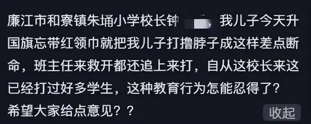 日前,有网友在社交平台发布视频称,广东廉江和寮镇的朱埇小学校长因学生忘戴红领巾撸学生脖子,班主任上前拉开,校长还追上来打,引发广泛关注。