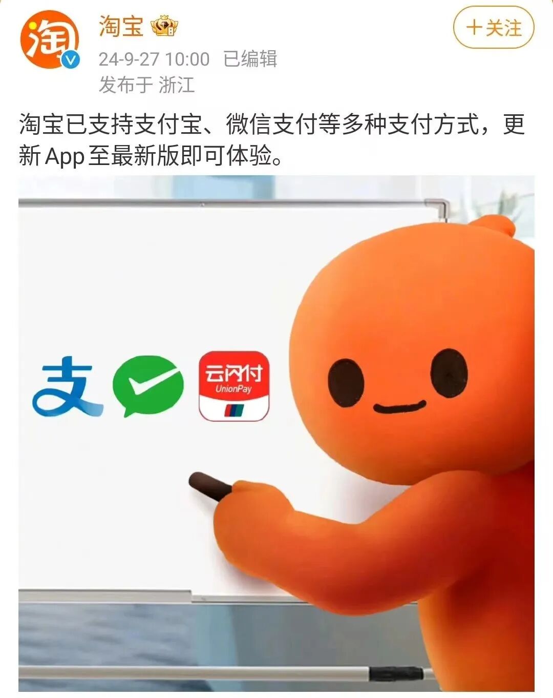 淘宝今起正式接入微信支付,京东也将正式接入支付宝支付!发表时间:2024-09-27 14:37来源:西部时报
