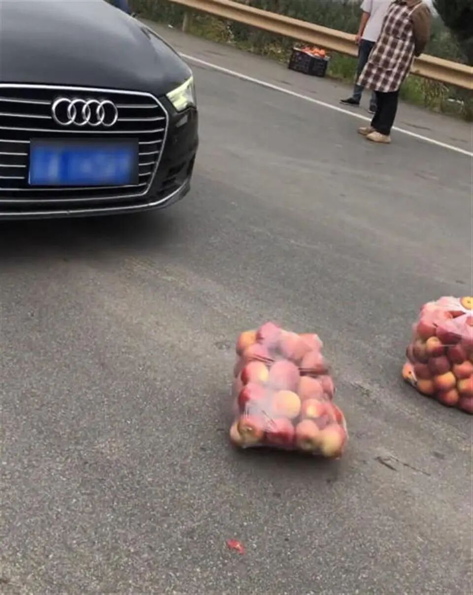 网传画面显示,有过路车辆被逼停后,果农继续往车前摆苹果,有司机气不过直接碾过去反被果农指责“你怎么敢压我们昭通的土特产”,司机表示:“你们这样摆,开车的很危险!”