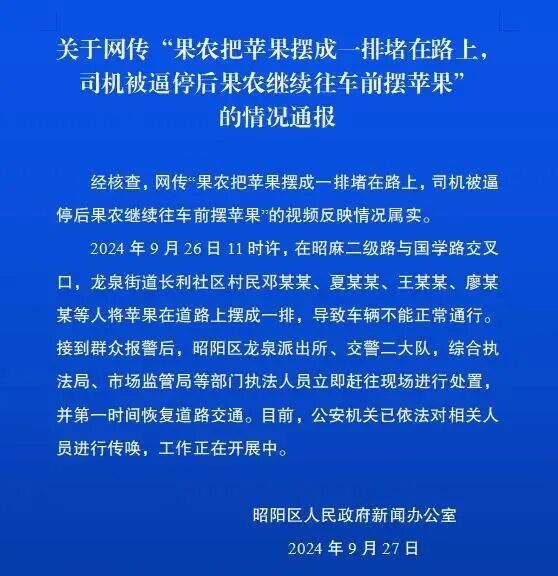 云南昭通多名果农用苹果堵路逼停车辆?官方通报:已对相关人员传唤