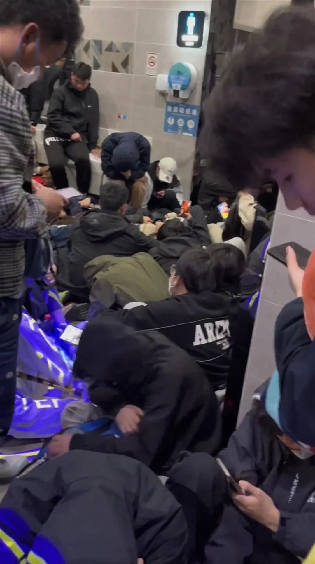 网传视频画面显示,多人或坐或躺在厕所里过夜,有人盖着毯子,有人则穿着单衣席地而坐。现场还有语音提醒:“如果您执意夜宿,请您遵守公共秩序,不要影响他人正常如厕。”