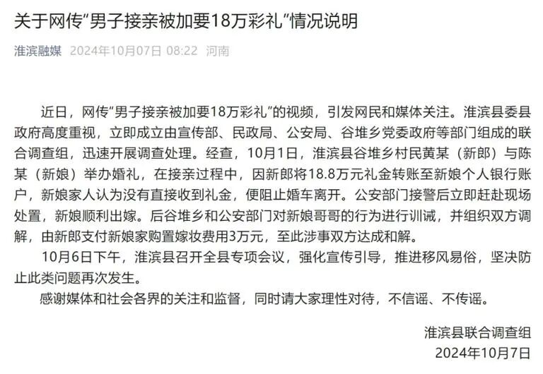 河南信阳一新郎接亲被要求追加18万彩礼,官方通报发表时间:2024-10-08 11:01来源:西部时报