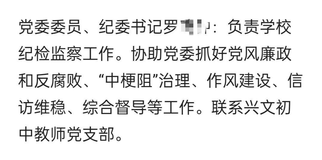 据巴中中学官网显示,罗某为该校党委委员、纪委书记,负责学校纪检监察工作。协助党委抓好党风廉政和反腐败、“中梗阻”治理、作风建设、信访维稳、综合督导等工作。