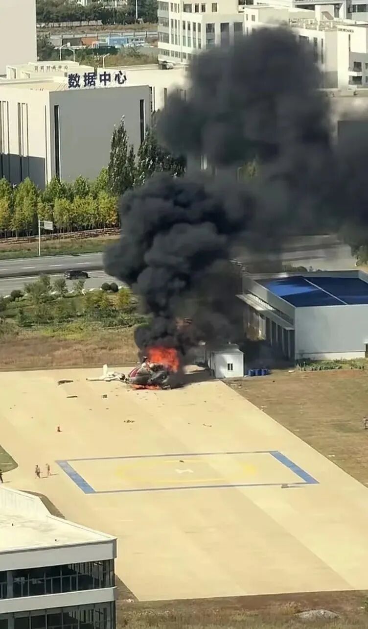 另一段视频显示,坠落位置疑似是直升机停机坪,直升机机身断成两截,机体部分正在燃烧。据视频拍摄者在视频中介绍,该机在空中曾发生过爆炸,坠毁后仍有爆炸声传出。