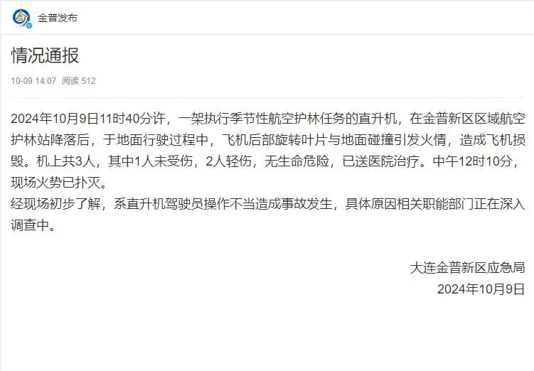 突发!辽宁大连一架直升机撞地起火,官方通报