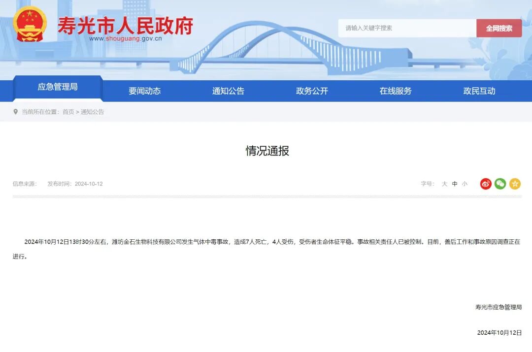 2024年10月12日13时30分左右,潍坊金石生物科技有限公司发生气体中毒事故,造成7人死亡,4人受伤,受伤者生命体征平稳。事故相关责任人已被控制。目前,善后工作和事故原因调查正在进行。