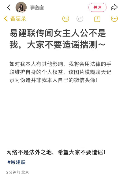 事后,疑似易建联事件“女主”辟谣称:“该图片模糊聊天记录为伪造,并非我本人自己的微信头像!”并表示:“网络不是法外之地,希望大家不要造谣!” ![]() 此外,还有网友以易建联身份证显示地址为俱乐部或酒店,不符合常理为由,认为身份证图片有可能是P的。 截至目前,易建联本人尚未就此事进行回应。 另据媒体报道,在此之前,易建联代言或合作的品牌有20家左右。截至目前,在这些品牌的官方微博上,只有耐克、德邦快递、欧莱雅男士等7家还保留着易建联相关的文章。而包括中国人寿、广发银行、OPPO等企业以及上周刚刚代言的天然博士等品牌官微上都已搜索不到易建联的名字了。 公开资料显示,易建联,1987年10月27日出生于中国广东,前中国职业篮球运动员,曾效力于广东宏远队、密尔沃基雄鹿队、新泽西网队等CBA、NBA球队。2023年8月29日,易建联在个人社交媒体宣布退役。12月29日,易建联的球衣退役仪式在东莞篮球中心举行。 END 来源:新华日报、大风新闻、新黄河、极目新闻、重庆晨报 编辑:王宇豪 排版:王宇豪 审核:溪溪