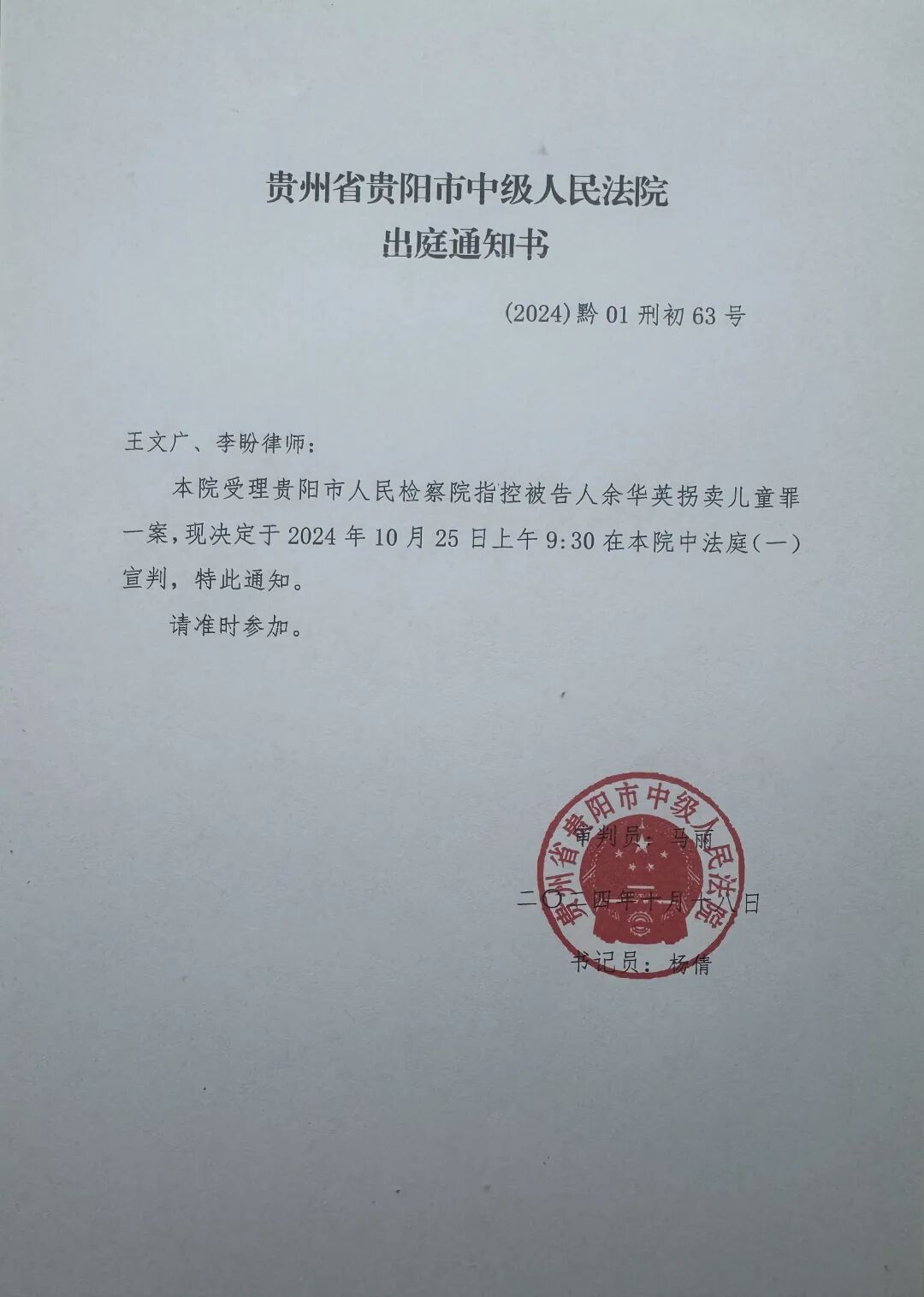 据央视新闻报道,贵州省贵阳市中级人民法院将于(本周五)10月25日上午九点半,对余华英拐卖儿童案重审一审宣判。