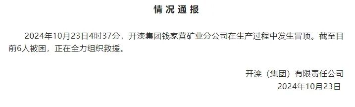 据开滦集团官方消息,2024年10月23日4时37分,开滦集团钱家营矿业分公司在生产过程中发生冒顶。截至目前6人被困,正在全力组织救援。