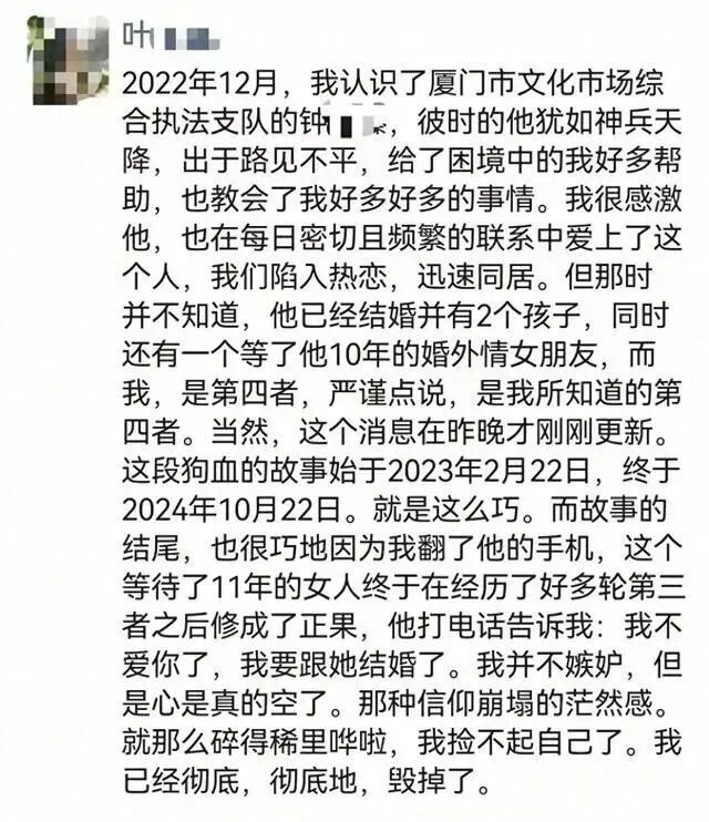 近日,网传一女子在朋友圈自称系厦门文化市场综合执法支队一干部的第四者,引发关注。 ![]() 根据网传截图显示,2022年12月,该女子认识了厦门市文化市场综合执法支队的钟某臻,而钟某臻给予了困境中的她很多的帮助,用她的话来说就是“彼时的他犹如神兵天降”。两个人陷入热恋,迅速同居。但是该女子却不知道,当时的钟某臻已经结婚并且生育有两个孩子,“同时还有一个等了他10年的婚外情女朋友。"结果自己成为了“第四者”。 ![]() 2024年10月22日,该女子接到钟某臻的电话,称不再爱她,要和第三者结婚了。