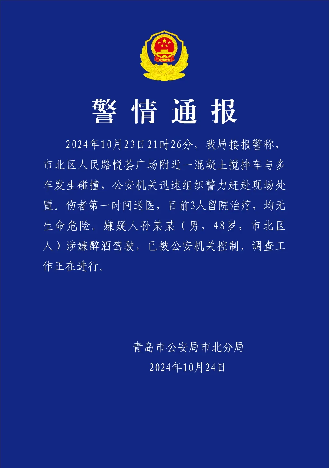 10月24日凌晨,山东青岛市公安局市北分局就青岛悦荟广场附近一混凝土搅拌车与多车发生碰撞,发布警情通报。通报全文如下: