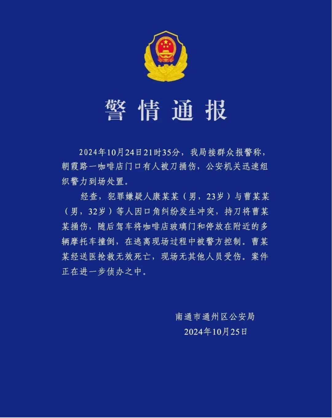 25日凌晨2时17分,江苏南通市通州区公安局对外发布公告,2024年10月24日21时35分,接群众报警称,朝霞路一咖啡店门口有人被刀捅伤,公安机关迅速组织警力到场处置。