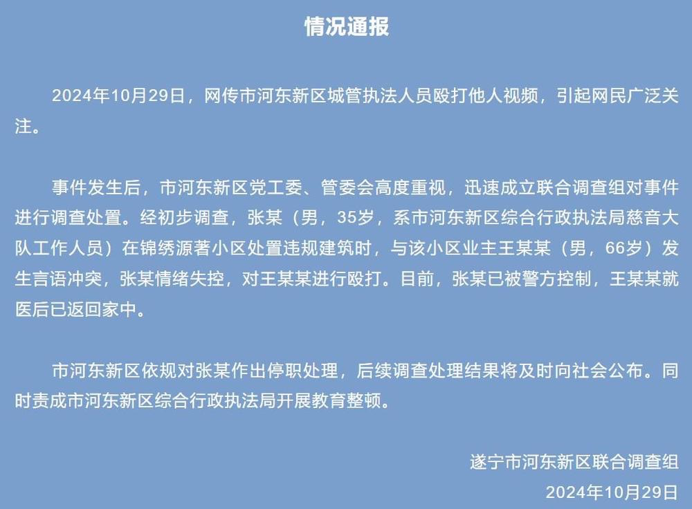 10月29日上午,四川遂宁一男业主在小区内突遭城管队员殴打一幕被监控清晰拍下,引发关注。 ![]() 网传视频画面显示,一小区的空旷处站着数名穿制服的城管队员,其旁边站着一些业主,有人带着小孩。突然,一名城管队员飞起一脚踢向一名男子,然后挥拳对他进行殴打。被打男子一直往后退,后来被对方打倒在地,但该城管队员没有停止,仍旧抡拳击打,其他城管队员和业主见状上前劝阻拉开。 另一段19秒视频中,被打男子头发花白,头部流血,左眼和左脸处有两道长长的血流痕迹,他右手拿着衣服,左手在打电话,画外音是一名女子的声音,“城管局的人进来,在小区里面打业主。” ![]() 据了解,事发地为四川省遂宁市河东新区“敏捷锦绣源著”小区,事发时间为10月29日上午9:41左右。一位目击者介绍,事发后有人报警,被打男子被送到医院救治。 另据被打男子介绍,他姓王,今年66岁,家住该小区18楼。事发时他从楼上下来,看到2名男城管队员和1名女城管队员在小区叠拼处检查,后来他与那名女城管因言语发生冲突,随即被其他城管队员劝走。过了一会儿,小区外又进来了几名男城管队员,其中一名男城管队员年约30岁,“他得知那名女城管队员与我骂架后,便反过来辱骂我,我回骂他时,没想到他突然飞起一脚朝我踢来,将我打倒在地。” 事发后,王先生被送到遂宁市中心医院检查,门诊病情证明书显示,“左眉部见一长2cm的皮肤裂伤,深达肌肉层,周围肿胀明显。”医生立即进行左眉部皮肤裂伤清创缝合术,破伤风免疫球蛋白注射。 遂宁市城管局河东新区分局一工作人员回应称,事发小区有高层也有叠拼,10月29日上午,城管队员根据工作安排前往事发小区对叠拼违建的整改情况“回头看”,这时家住该小区高层的男子王先生路过现场,与一名女城管队员发生言语冲突,后来双方平息准备离开,这时几名男城管队员到来,“业主王某辱骂其中一名年轻的男城管队员,对方顿时情绪失控,冲上前去殴打他。” 该工作人员介绍称,事发后他们立即派专人将被打业主王某送到医院做全身体检,“只是轻微伤,我们也报了警,目前警方正介入调查。”经初步了解,那名打人城管队员系临聘人员,已被停职,与此事有关的其他城管队员也被停职处理,他们正在配合警方调查,届时城管局会发通报。 小区物业则表示,当天上午确有该小区高层业主被城管队员殴打一事,具体情况不太清楚,目前警方正在调查处理此事。 10月29日,遂宁市河东新区联合调查组发布情况通报,全文如下: ![]() END 来源:遂宁新闻网、大风新闻 编辑:王宇豪 排版:王宇豪 审核:溪溪