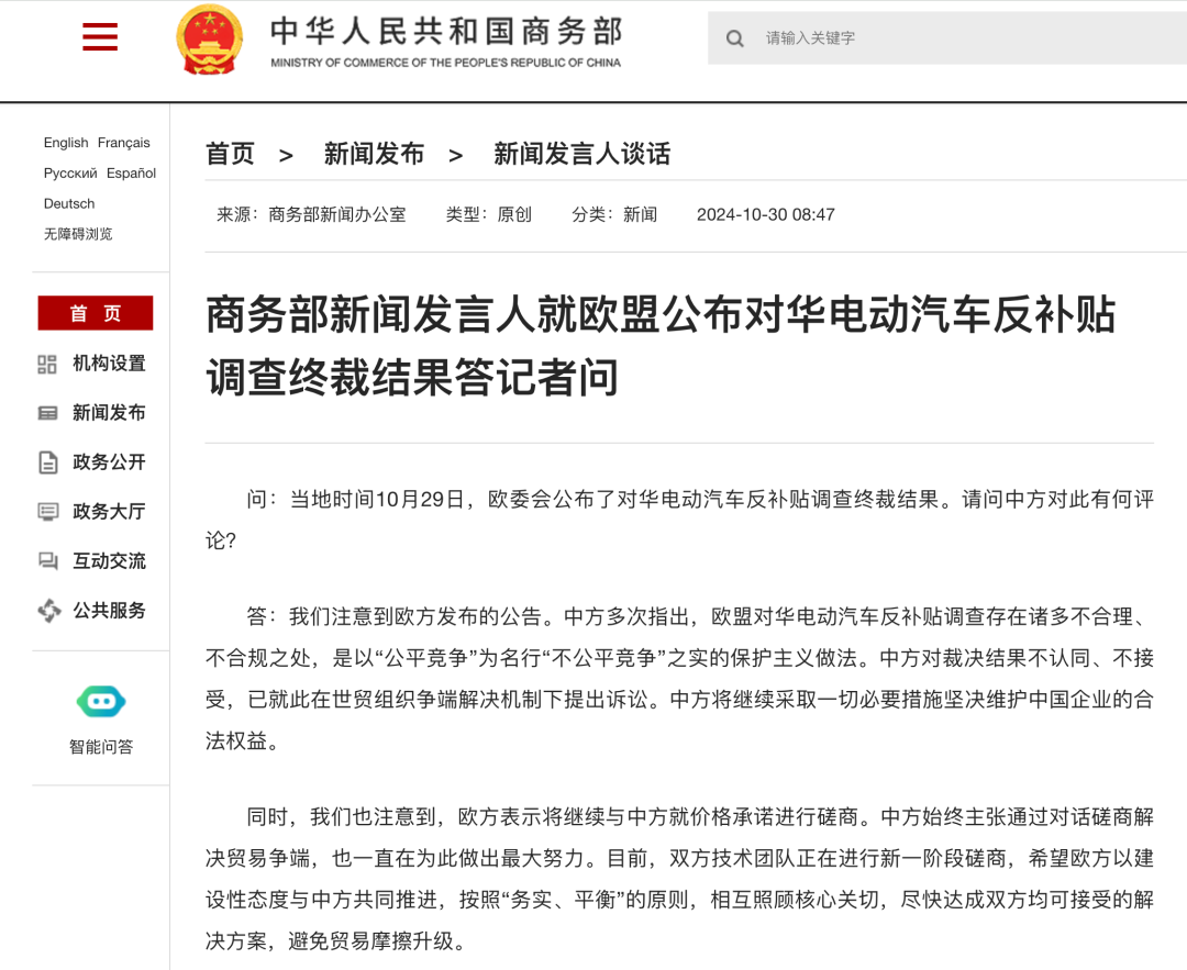 中方对欧盟裁决结果:不认同、不接受!发表时间:2024-10-30 17:19来源:西部时报 ![]() 当地时间10月29日,欧盟委员会发布消息称结束了反补贴调查,决定对从中国进口的电动汽车(BEV)征收为期五年的最终反补贴税。 相关决定预计将于当地时间30日在《欧盟官方公报》上公布,反补贴税将于31日起正式实施。 被抽样的中国出口生产商将被征收以下反补贴税:比亚迪:17.0%、吉利:18.8%、上汽集团:35.3%,其他合作公司将被征收20.7%的关税。 在提出个别审查请求后,特斯拉将被征收7.8%的关税。所有其他不合作的公司将被征收35.3%的关税。 2024年7月4日对从中国进口的电动汽车征收的临时关税将不予征收。 据商务部最新消息,商务部新闻发言人就欧盟公布对华电动汽车反补贴调查终裁结果答记者问。 问:当地时间10月29日,欧委会公布了对华电动汽车反补贴调查终裁结果。请问中方对此有何评论? 答:我们注意到欧方发布的公告。中方多次指出,欧盟对华电动汽车反补贴调查存在诸多不合理、不合规之处,是以“公平竞争”为名行“不公平竞争”之实的保护主义做法。中方对裁决结果不认同、不接受,已就此在世贸组织争端解决机制下提出诉讼。中方将继续采取一切必要措施坚决维护中国企业的合法权益。 同时,我们也注意到,欧方表示将继续与中方就价格承诺进行磋商。中方始终主张通过对话磋商解决贸易争端,也一直在为此做出最大努力。目前,双方技术团队正在进行新一阶段磋商,希望欧方以建设性态度与中方共同推进,按照“务实、平衡”的原则,相互照顾核心关切,尽快达成双方均可接受的解决方案,避免贸易摩擦升级。 ![]() 来源:综合央视新闻、商务部网站 编辑:开心 | 审核:溪溪 END 实时播报,关注民声 投稿:gaojian@xibunews.com 如有不实,侵权请联系作者 声明:部分文章来源于网络,转载发布,版权归原作者所有,仅作为参考,如果网站中图片和文字侵犯了您的版权,请联系我们处理!发布是出于传递更多信息之目的并不意味着赞同其观点或证实内容的真实性。http://www.westtimes.cn/h-nd-2776.html