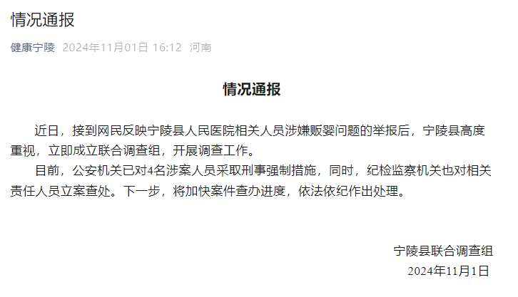 近日,接到网民反映宁陵县人民医院相关人员涉嫌贩婴问题的举报后,宁陵县高度重视,立即成立联合调查组,开展调查工作。