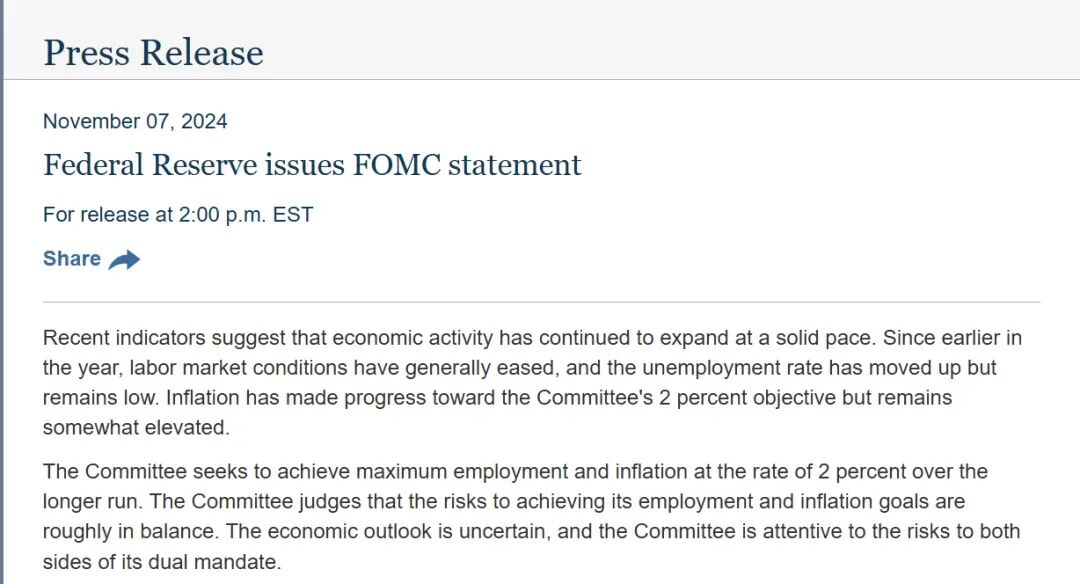 当地时间11月7日,美国联邦储备委员会宣布,将联邦基金利率目标区间下调25个基点,降至4.5%至4.75%之间的水平。 这是美联储年内继9月份降息50个基点以来的第二次降息,标志着美国货币政策已经进入了宽松周期。