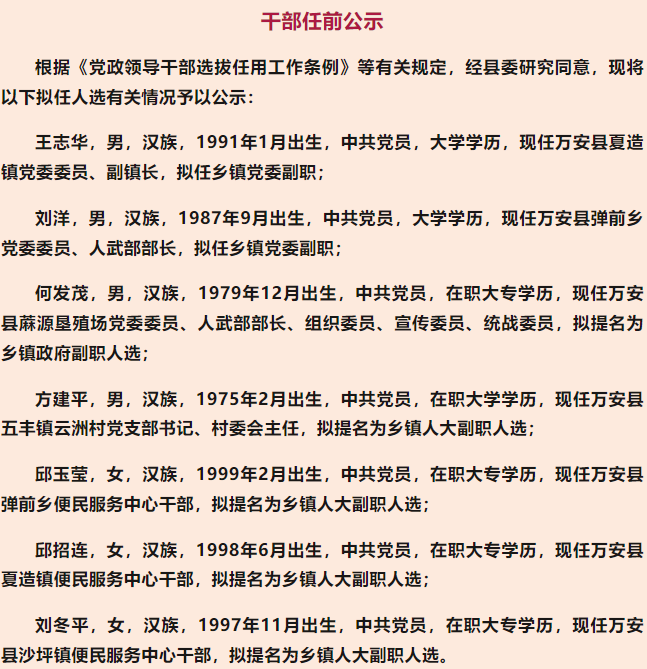 近日,江西吉安市万安县委组织部发布一则干部任前公示,其中包括3名“95后”年轻女干部,拟提名乡镇人大副职,均为在职大专学历,引发广泛关注。