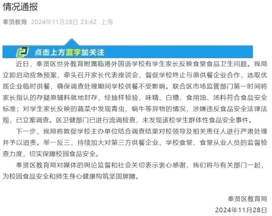 上海市奉贤区教育局11月28日晚发布情况通报称,该局立即启动应急预案,牵头召开家长代表座谈会,督促学校终止与原供餐企业合作,选取优质企业临时供餐,确保调查处理期间学校供餐不受影响。联合区市场监管部门第一时间将家长指认的存疑原辅料就地封存,经抽样检验,味精、白糖、食用油、汤料符合食品安全标准;对学生家长反映的蔬菜中发现青虫、蜗牛等异物的情况,涉嫌违反食品安全法律法规,已立案调查。区卫健部门已进行流调检查,未发现该校学生群体性食品安全事件。
