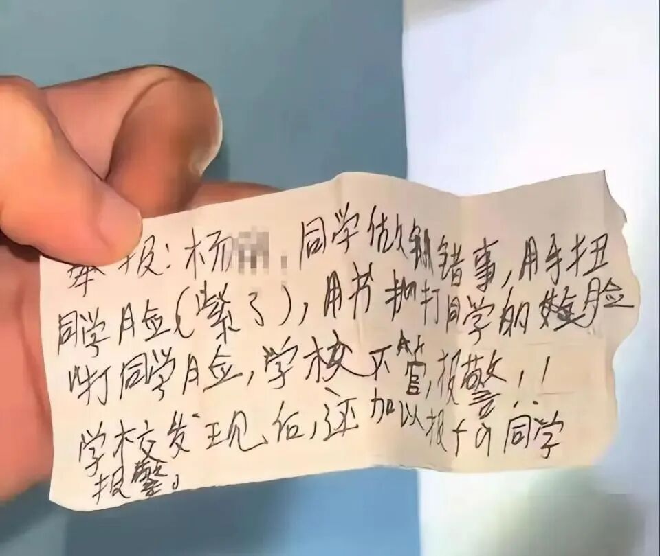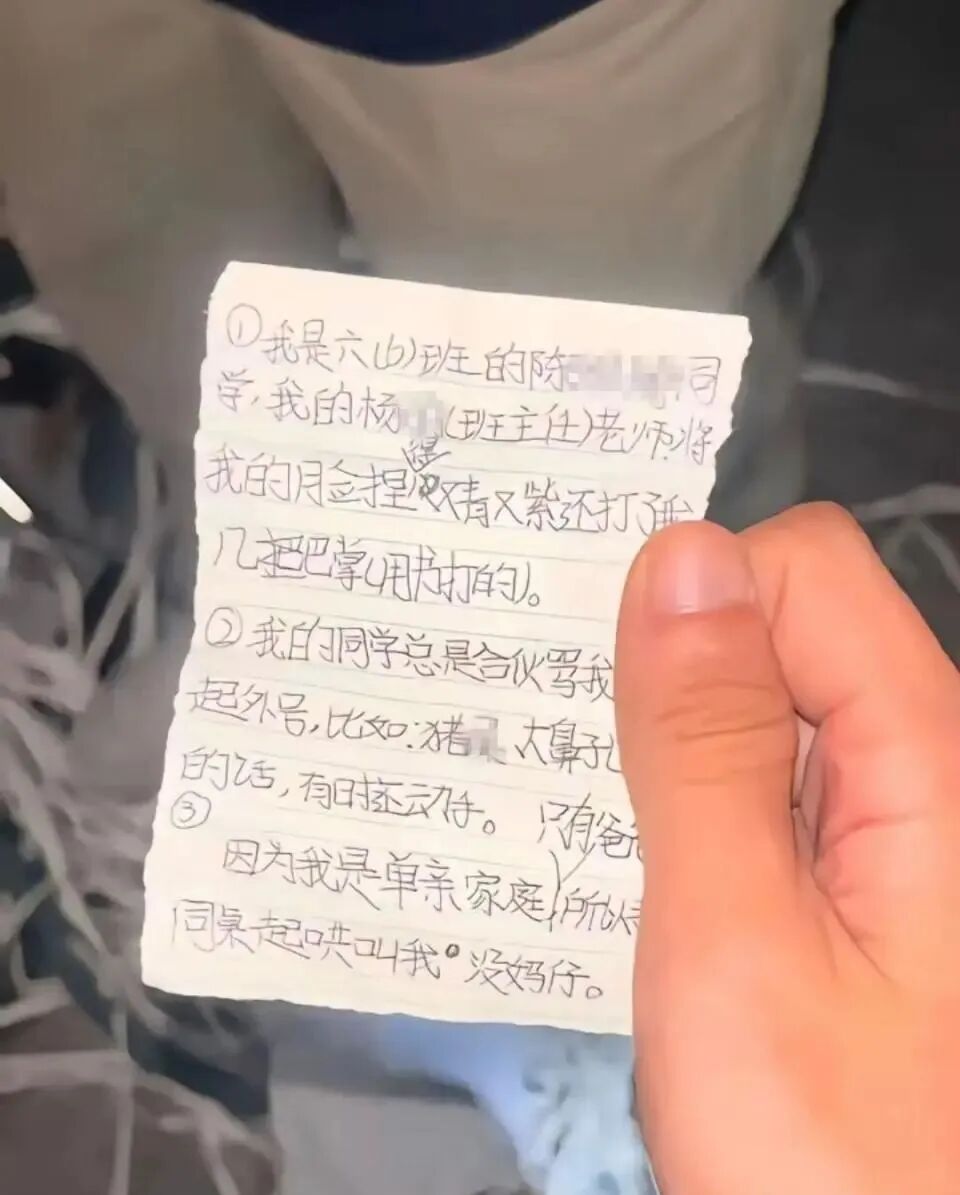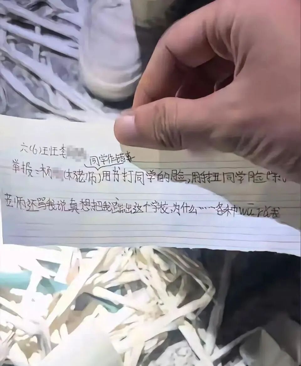 12月1日,浙江温州瑞安市一网友在社交平台发布视频称,自己在前几日夜里和多名朋友一同前往已经废弃的锦湖实验小学,在一个投诉信箱内发现多封举报信,内容涉及某教师殴打学生。12月2日,瑞安市教育局工作人员称,已有相关科室介入调查。 ![]() 据视频发布者描述,锦湖实验小学该校区因当地建设规划,于2023年下半年废弃,尚未拆除。自己当时和朋友打闹,把锁上的投诉信箱门拍坏了,于是发现其中有多封举报信,均是由该校学生所写。 ![]() 网传视频画面显示,该投诉信箱上面标有“校园悄悄话”“警察叔叔信箱开通啦!”“想说的、不敢说的都可以给我们来信”等内容。举报信中既有举报“老师借红笔未归还”“同学打闹”等内容,也有两封对老师的举报信。内容为:“杨某老师把我的脸捏得又青又紫”“因为我是单亲家庭,同学都叫我‘没妈仔’”。 ![]() 视频发布者称自己将向当地教育局反映,截至12月2日,其发布的视频已下架。温州瑞安市教育局工作人员表示:“今天上午接到了相关的反馈,已经有相关科室介入调查。” ![]() 据了解,在信中被举报的教师杨某的现工作单位为瑞安市毓蒙小学,该校工作人员称,此事需要核实情况。 据毓蒙小学工作人员介绍,2023年下半年,锦湖实验小学一所分校因当地高速路建设规划原因拆迁,二十多名教师被分流,其中杨某被分流至毓蒙小学。校方工作人员对比表示:“目前我们还没掌握这个情况,需要进一步核实。 END 来源:现代快报 编辑:王宇豪 排版:王宇豪 审核:溪溪