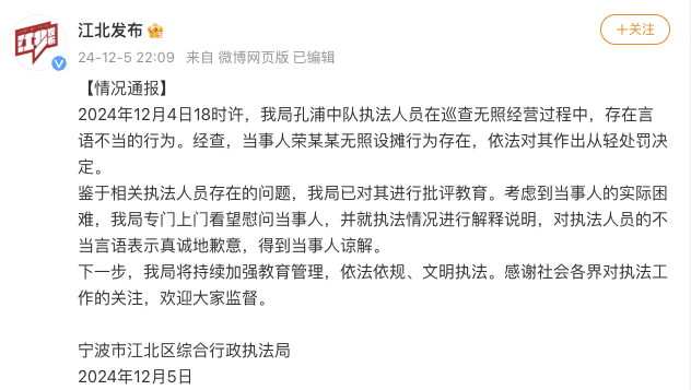 浙江宁波一摊贩没钱交罚款,被城管要求去借钱交?官方通报发表时间:2024-12-06 19:31来源:西部时报