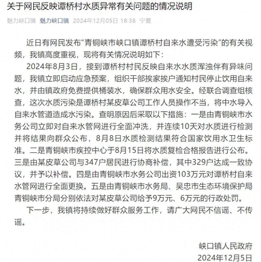 近日,有网民发布“青铜峡市峡口镇谭桥村自来水遭受污染”的有关视频,宁夏吴忠青铜峡市峡口镇人民政府12月5日发布情况说明。