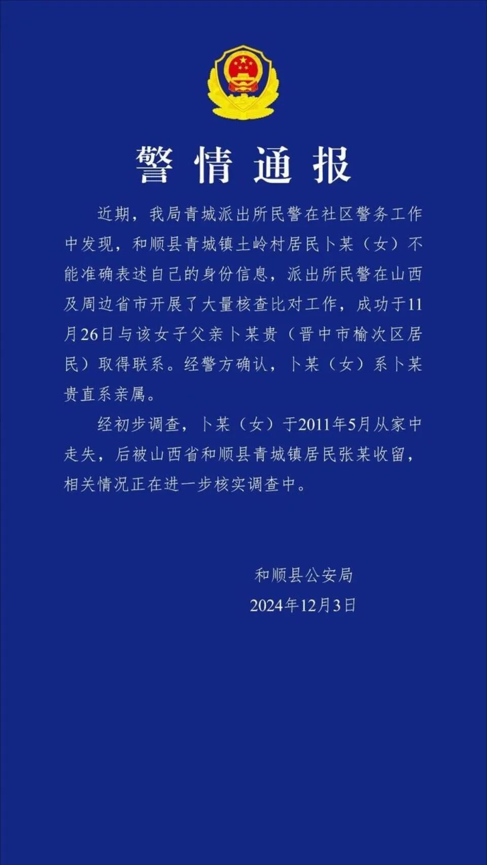 此前据媒体报道,今年11月25日,晋中市和顺县一名女子向寻亲志愿者朱玉堂求助,称其婶婶十多年前开始跟其叔叔一起生活,后面有了两个孩子,希望能帮婶婶找到亲人。朱玉堂见到了其婶婶,“在交流中,我发现她识字,而且感觉学历还不低,我就慢慢地引导她,渐渐的,她说出了自己的名字、父母、哥哥名字、还有自己就读的学校等信息”。经警方查询核实,证实该女子的婶婶正是走失13年的卜某。目前,卜女士正在山西省精神卫生中心接受治疗。