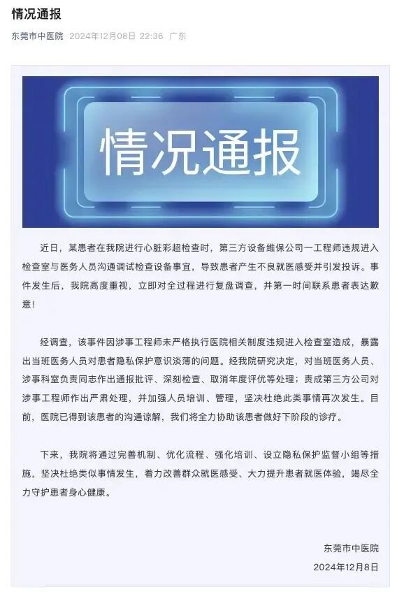 近日,一位网友发帖称,她在东莞市中医院裸露上半身做心脏彩超时,一名自称工程师的男子闯入,医生却不管,任由男子在病房内停留,并一边检查一边与该男子聊天。之后,她投诉此事,得到的回应是当时进入病房的男子是维修彩超设备的。她认为男子的行为侵犯了隐私,遂进行了举报。 ![]() 针对此事,12月8日晚,“东莞市中医院”通报称,近日,某患者在该院进行心脏彩超检查时,第三方设备维保公司一工程师违规进入检查室与医务人员沟通调试检查设备事宜,导致患者产生不良就医感受并引发投诉。事件发生后,该院高度重视,立即对全过程进行复盘调查,并第一时间联系患者表达歉意。 经调查,该事件因涉事工程师未严格执行医院相关制度违规进入检查室造成,暴露出当班医务人员对患者隐私保护意识淡薄的问题。经医院研究决定,对当班医务人员、涉事科室负责同志作出通报批评、深刻检查、取消年度评优等处理;责成第三方公司对涉事工程师作出严肃处理,并加强人员培训、管理,坚决杜绝此类事情再次发生。目前,医院已得到该患者的沟通谅解,将全力协助该患者做好下阶段的诊疗。 通报表示,接下来,医院将通过完善机制、优化流程、强化培训、设立隐私保护监督小组等措施,坚决杜绝类似事情发生,着力改善群众就医感受、大力提升患者就医体验,竭尽全力守护患者身心健康。 END 实时播报,关注民声 投稿:gaojian@xibunews.com 如有不实,侵权请联系作者 声明:部分文章来源于网络,转载发布,版权归原作者所有,仅作为参考,如果网站中图片和文字侵犯了您的版权,请联系我们处理!发布是出于传递更多信息之目的并不意味着赞同其观点或证实内容的真实性。http://www.westtimes.cn/h-nd-3492.html