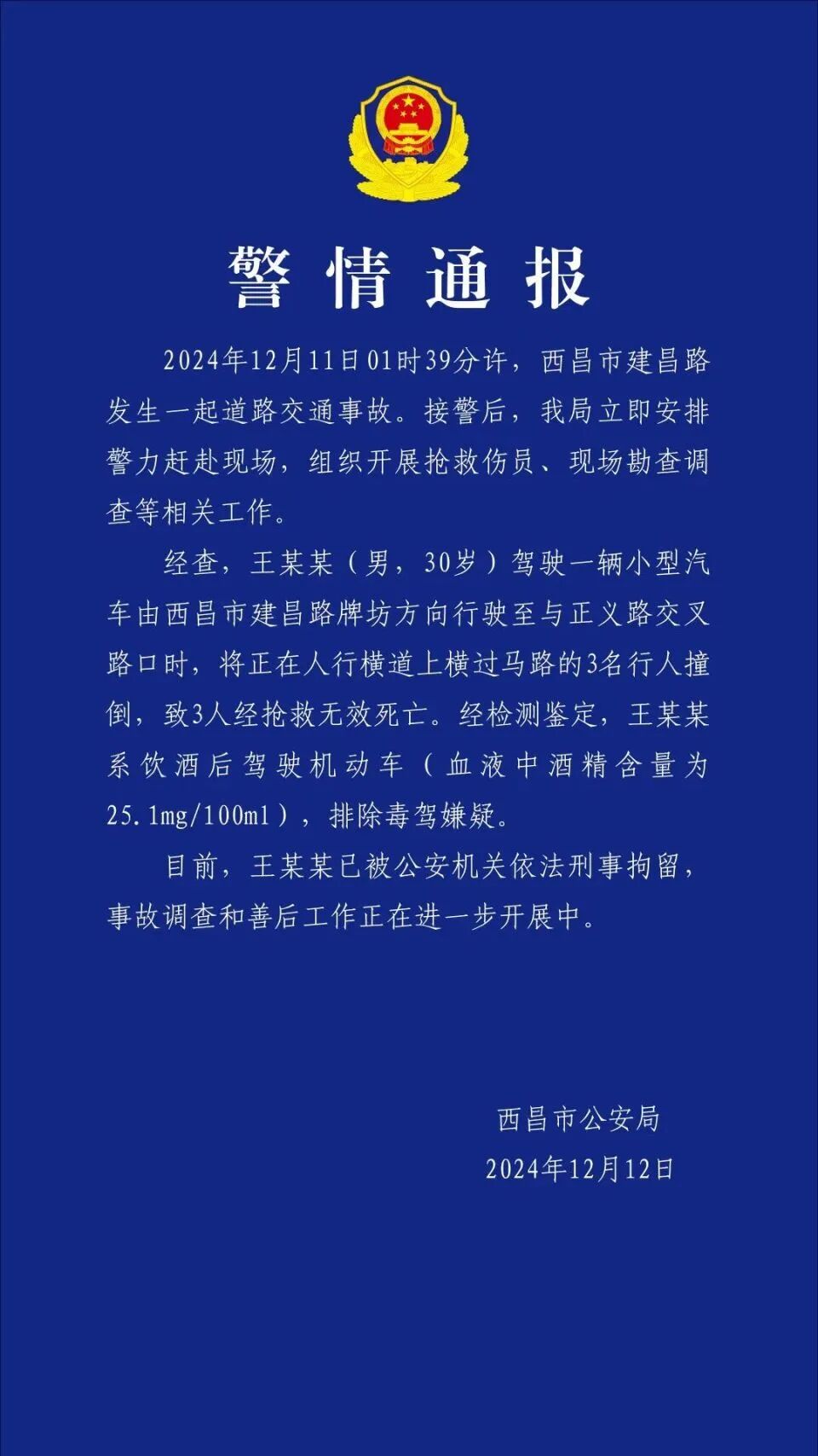 男子酒后驾车撞倒行人致3人死亡,四川西昌警方通报