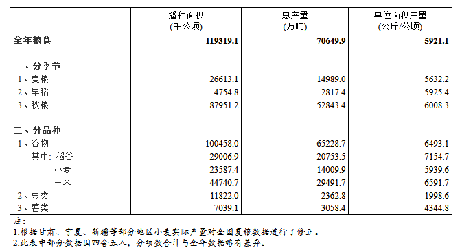 12月13日,国家统计局网站发布消息,2024年全国粮食总产量14130亿斤,比上年增加221.8亿斤,增长1.6%,在连续9年稳定在1.3万亿斤以上的基础上,首次迈上1.4万亿斤新台阶。 国家统计局关于2024年粮食产量数据的公告 根据对全国31个省(区、市)的调查,2024年全国粮食播种面积、单位面积产量和总产量分别如下: 一、全国粮食播种面积119319千公顷(178979万亩),比2023年增加351千公顷(526万亩),增长0.3%。其中谷物[1]播种面积100458千公顷(150687万亩),比2023年增加532千公顷(797万亩),增长0.5%。 二、全国粮食单位面积产量5921公斤/公顷(395公斤/亩),比2023年增加75.8公斤/公顷(5.1公斤/亩),增长1.3%。其中谷物单位面积产量6493公斤/公顷(433公斤/亩),比2023年增加74.1公斤/公顷(4.9公斤/亩),增长1.2%。 三、全国粮食总产量70650万吨(14130亿斤),比2023年增加1109万吨(222亿斤),增长1.6%。其中谷物产量65229万吨(13046亿斤),比2023年增加1086万吨(217亿斤),增长1.7%。 国家统计局 2024年12月13日 注:[1]谷物主要包括稻谷、小麦、玉米及谷子、高粱、大麦、燕麦和荞麦等。 表1 2024年全国粮食播种面积、总产量及单位面积产量情况