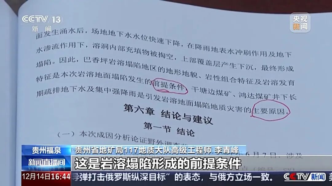 贵州省地质矿产勘查开发局117地质大队高级工程师李青峰介绍,“从地质条件来说,巴香坪地区下面存在着很多岩溶溶洞,这些隐蔽的岩洞是岩溶塌陷形成的前提条件;第二,在周边的两家煤矿长期开采疏排地下水和地表降雨的共同作用下,诱发了地面塌陷形成。”